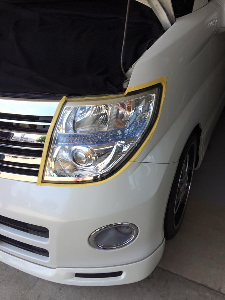 下記画像は、曇りかかったヘッドライトの磨き施工です。(日産エルグランド)