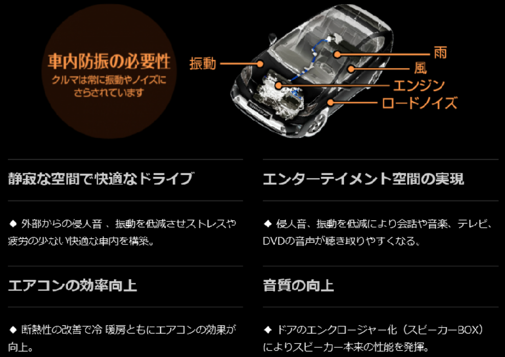車内が静かになるのはもちろん、断熱効果により冷暖房の効きも飛躍的にアップします。